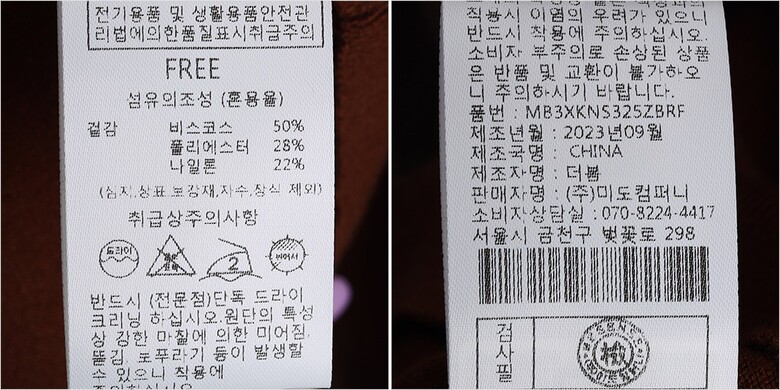 | 1. 제품 소재 (섬유의 조성 또는 혼용률을 백분율로 표시, 기능성인 경우 성적서 또는 허가서) | 겉감-폴리에스터28% 나일론22% 비스코스50% |