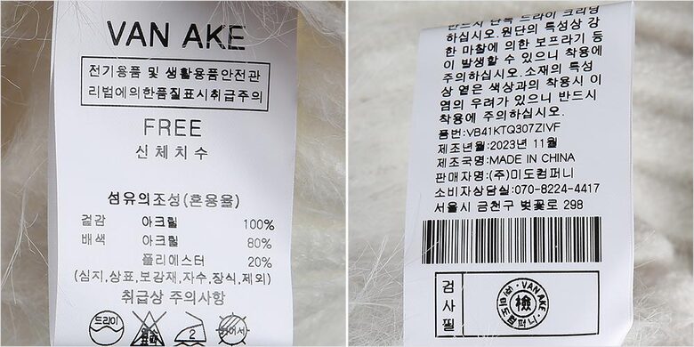| 1. 제품 소재 (섬유의 조성 또는 혼용률을 백분율로 표시, 기능성인 경우 성적서 또는 허가서) | 겉감-아크릴100% 배색-아크릴80% 폴리에스터20% |
