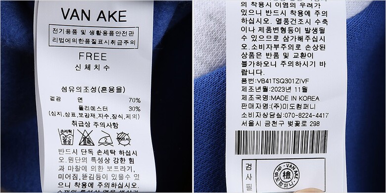 | 1. 제품 소재 (섬유의 조성 또는 혼용률을 백분율로 표시, 기능성인 경우 성적서 또는 허가서) | 겉감-면70% 폴리에스터30% |