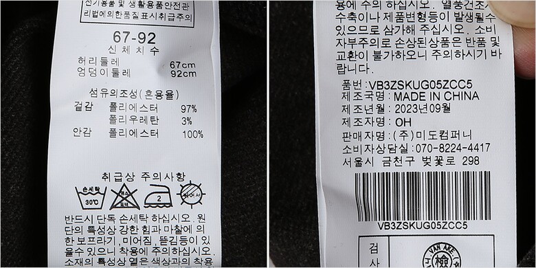 | 1. 제품 소재 (섬유의 조성 또는 혼용률을 백분율로 표시, 기능성인 경우 성적서 또는 허가서) | 겉감-폴리에스터97% 폴리우레탄3% 안감-폴리에스터100% |