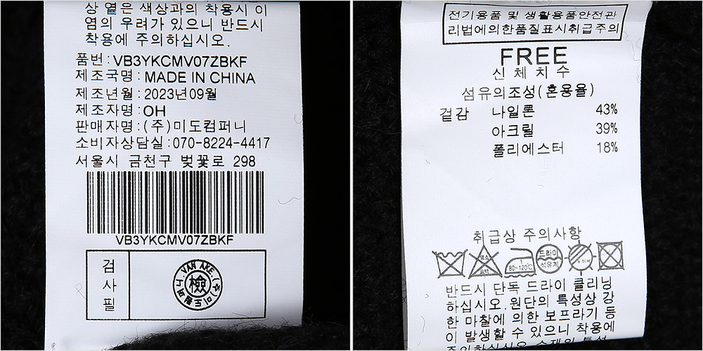 | 1. 제품 소재 (섬유의 조성 또는 혼용률을 백분율로 표시, 기능성인 경우 성적서 또는 허가서) | 겉감-폴리에스터18% 나일론43% 아크릴39% |