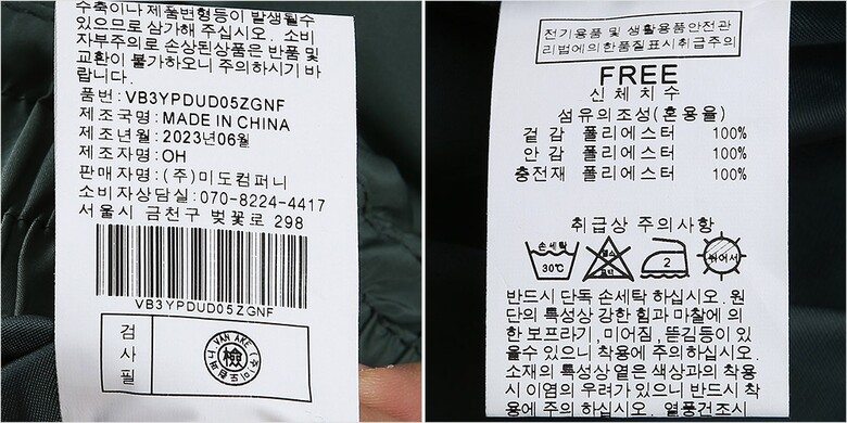 | 1. 제품 소재 (섬유의 조성 또는 혼용률을 백분율로 표시, 기능성인 경우 성적서 또는 허가서) | 겉감-폴리에스터100% 안감-폴리에스터100% 충전재-폴리에스터100% |