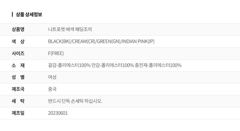 | 2. 색상 | 색상:BLACK(BK)/CREAM(CR)/GREEN(GN)/INDIAN PINK(IP) |