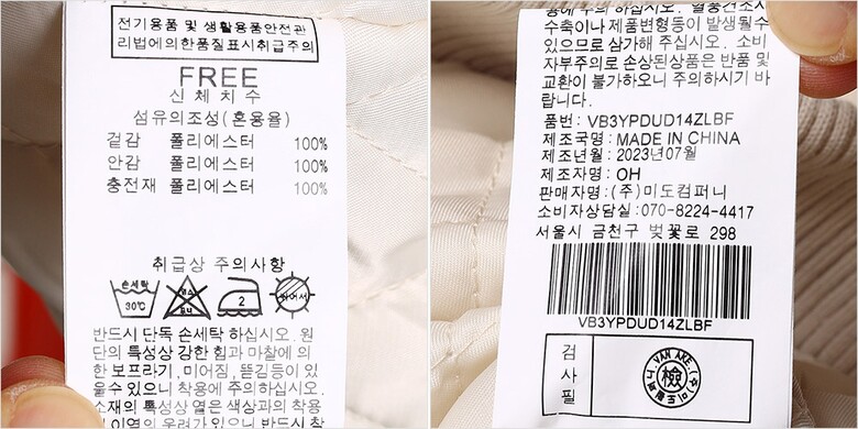 | 1. 제품 소재 (섬유의 조성 또는 혼용률을 백분율로 표시, 기능성인 경우 성적서 또는 허가서) | 겉감-폴리에스터100% 안감-폴리에스터100% 충전재-폴리에스터100% |