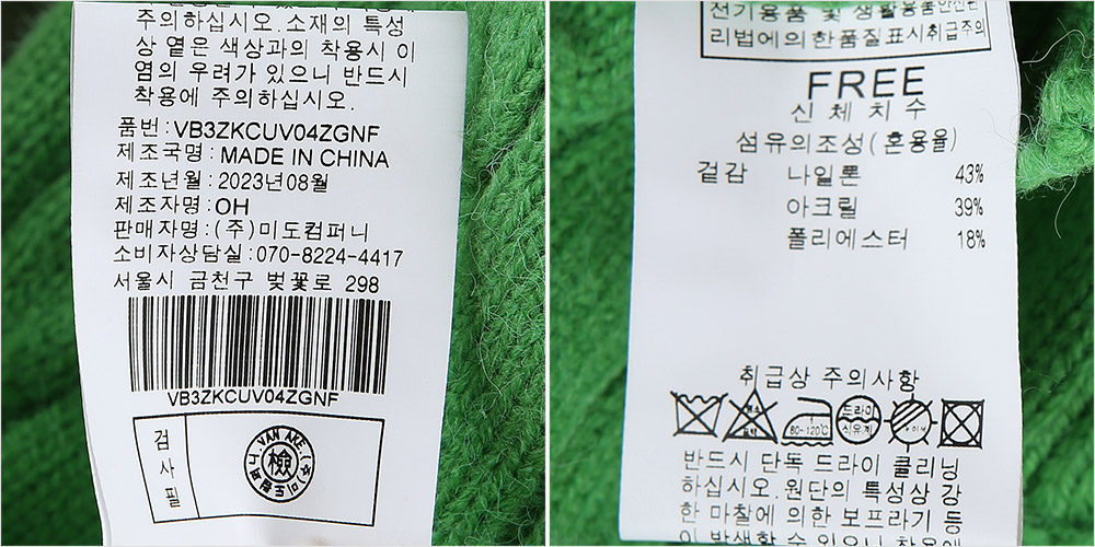 | 1. 제품 소재 (섬유의 조성 또는 혼용률을 백분율로 표시, 기능성인 경우 성적서 또는 허가서) | 겉감-폴리에스터18% 나일론43% 아크릴39% |