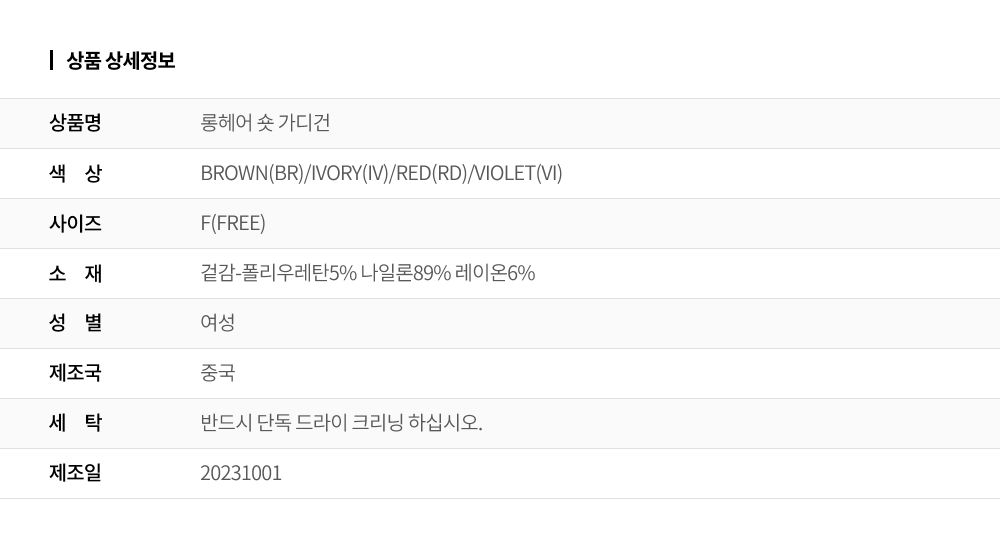 | 2. 색상 | 색상:BROWN(BR)/IVORY(IV)/RED(RD)/VIOLET(VI) |