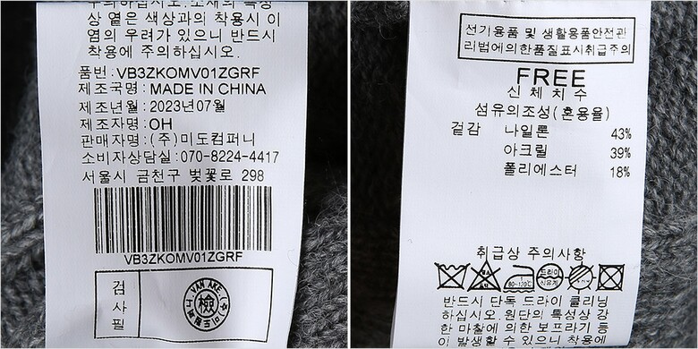 1. 제품 소재 (섬유의 조성 또는 혼용률을 백분율로 표시, 기능성인 경우 성적서 또는 허가서) 겉감-폴리에스터18% 나일론43% 아크릴39%