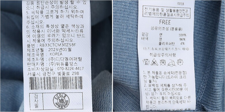 | 1. 제품 소재 (섬유의 조성 또는 혼용률을 백분율로 표시, 기능성인 경우 성적서 또는 허가서) | 겉감-면100% 배색-면96% 폴리우레탄4% |