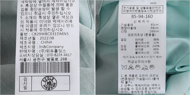 | 1. 제품 소재 (섬유의 조성 또는 혼용률을 백분율로 표시, 기능성인 경우 성적서 또는 허가서) | 겉감-폴리에스터12% 레이온88% 안감-폴리에스터100% 배색-폴리에스터12% 레이온88% |