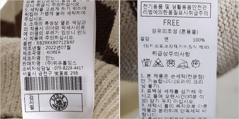 | 1. 제품 소재 (섬유의 조성 또는 혼용률을 백분율로 표시, 기능성인 경우 성적서 또는 허가서) | 겉감-면100% |