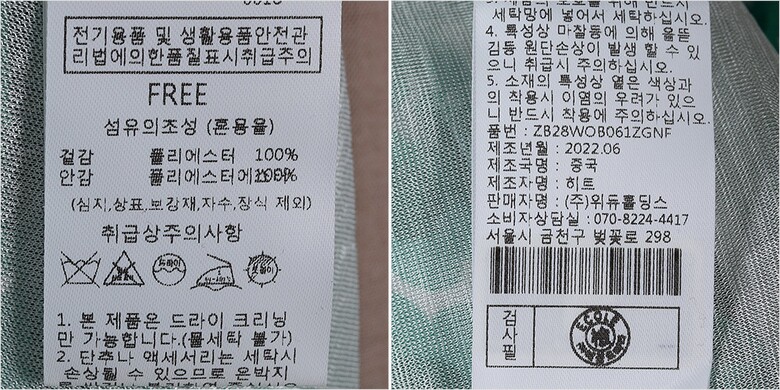 | 1. 제품 소재 (섬유의 조성 또는 혼용률을 백분율로 표시, 기능성인 경우 성적서 또는 허가서) | 겉감-폴리에스터100% 안감-폴리에스터100% |