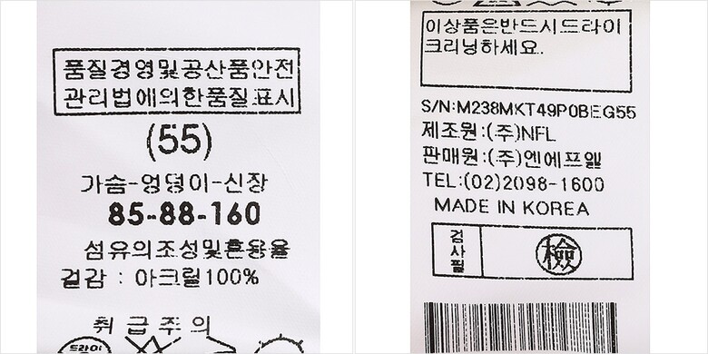 | 1. 제품 소재 (섬유의 조성 또는 혼용률을 백분율로 표시, 기능성인 경우 성적서 또는 허가서) | 겉감-아크릴100% |