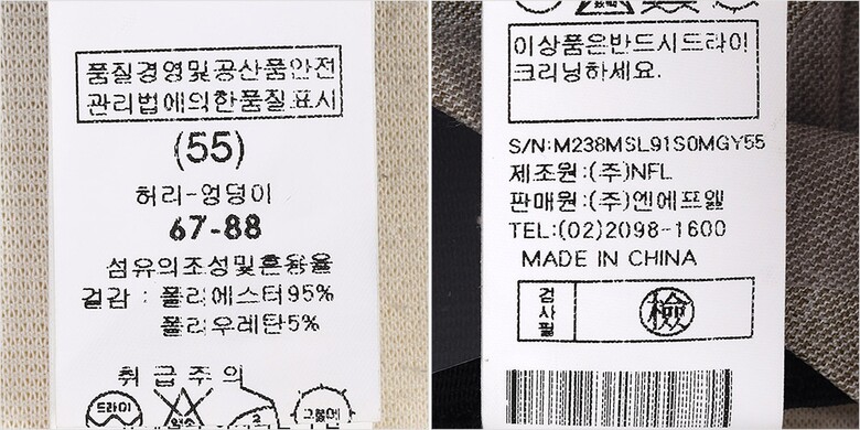 1. 제품 소재 (섬유의 조성 또는 혼용률을 백분율로 표시, 기능성인 경우 성적서 또는 허가서) 겉감-폴리에스터95% 폴리우레탄5%