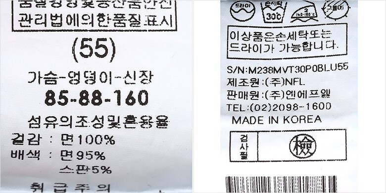 | 1. 제품 소재 (섬유의 조성 또는 혼용률을 백분율로 표시, 기능성인 경우 성적서 또는 허가서) | 겉감-면100% 배색- 면95% 스판5% |