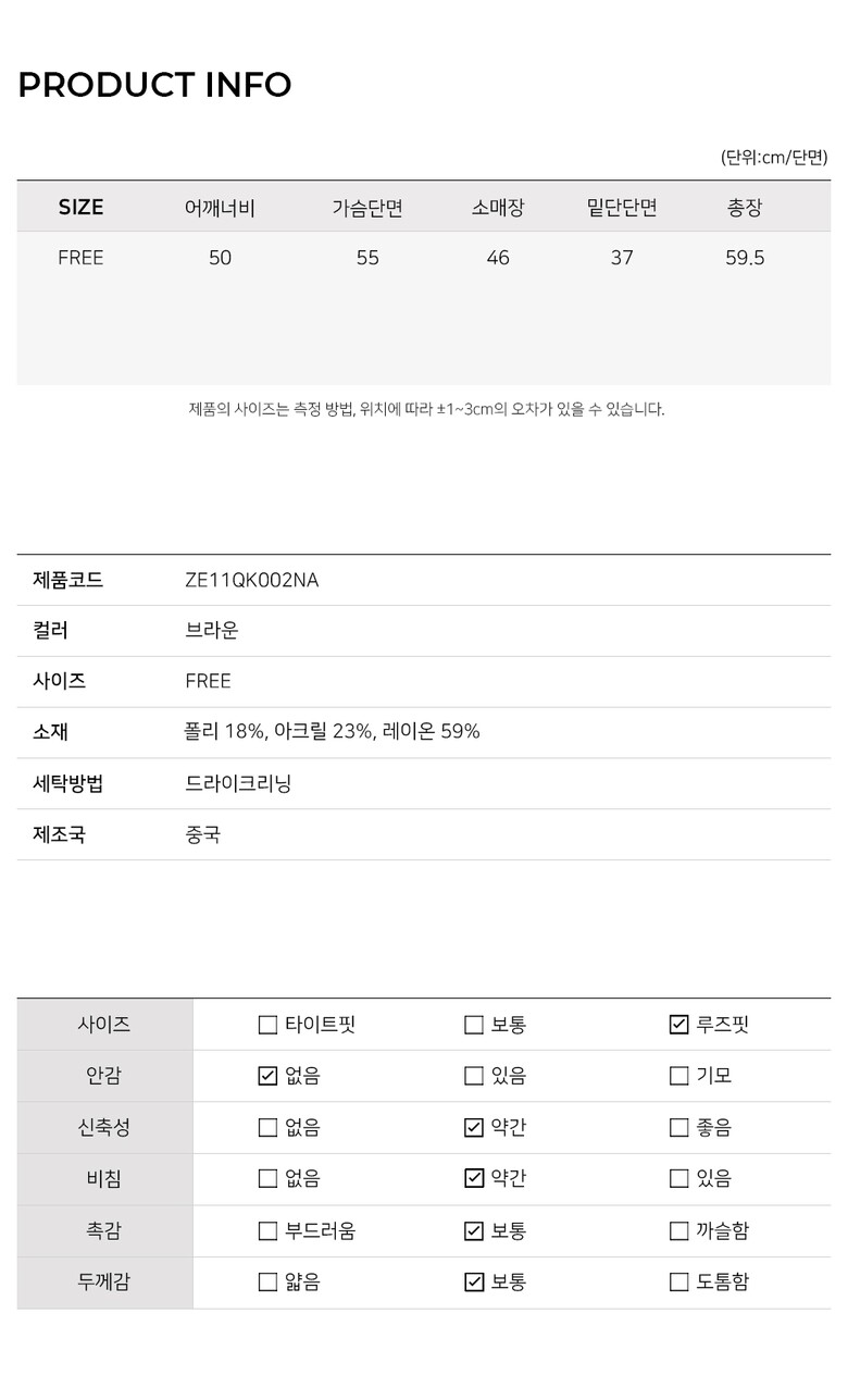1. 제품 소재 (섬유의 조성 또는 혼용률을 백분율로 표시, 기능성인 경우 성적서 또는 허가서) | 폴리에스터 18% 아크릴 23% 레이온 59% |
