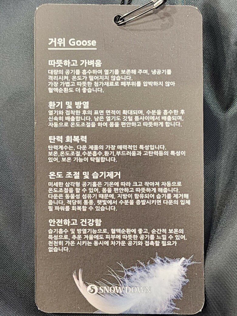 충전재 : 거위솜털 80%, 거위깃털 20%