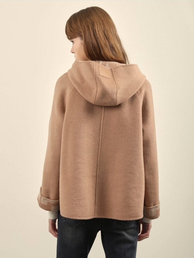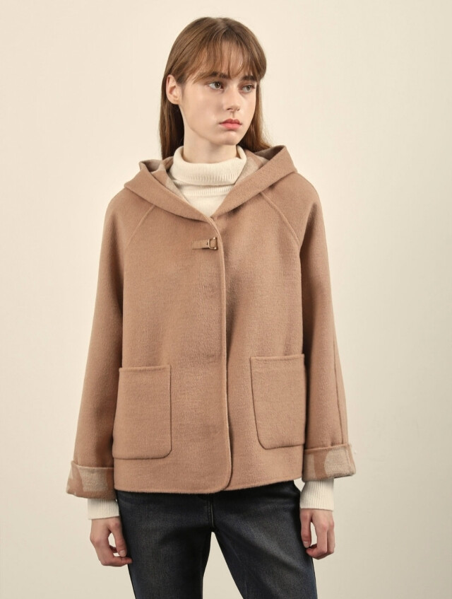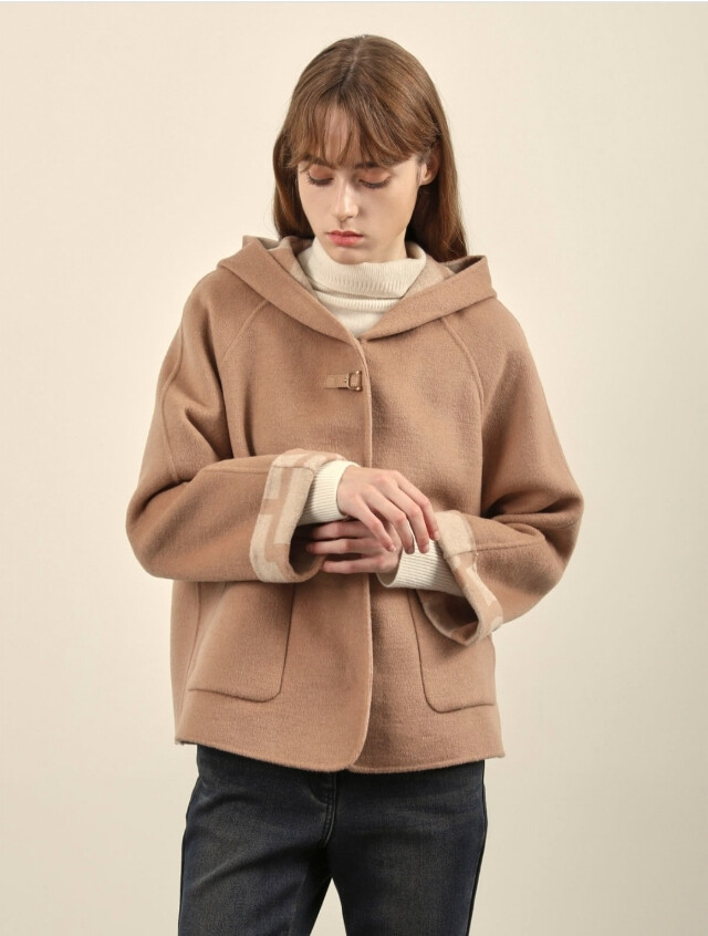 자가드 리버시블 소재가 매력적인 후두형 핸드자켓입니다 단기장의 자연스러운 A라인실루엣으로 캐주 얼하고 영한 감성으로 착용하실수 있고 소매 턴업 부 분과 후두 안쪽의 자가드 느낌이 한충 그급스러위보입니다