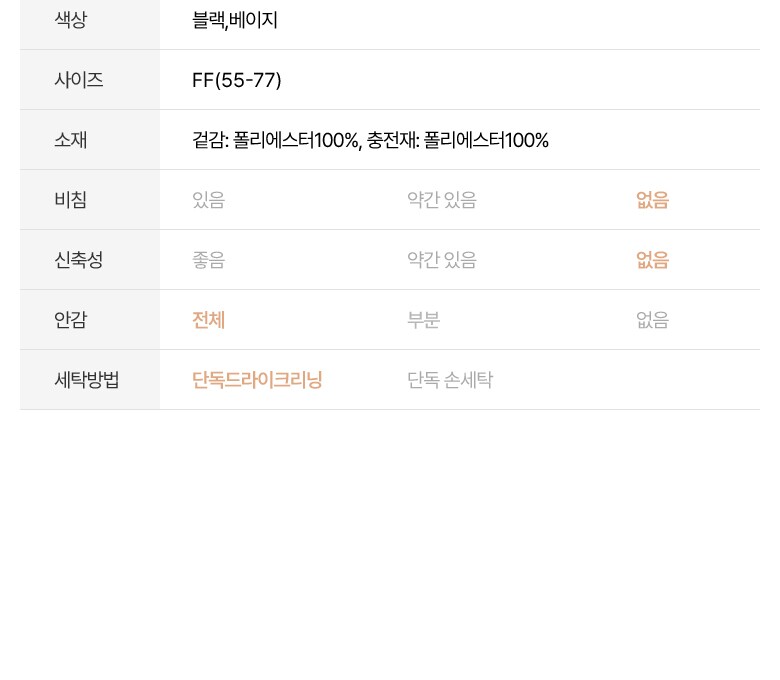 1. 제품 소재 (섬유의 조성 또는 혼용률을 백분율로 표시, 기능성인 경우 성적서 또는 허가서) | 겉감: 폴리에스터100% 충전재: 폴리에스터100% |