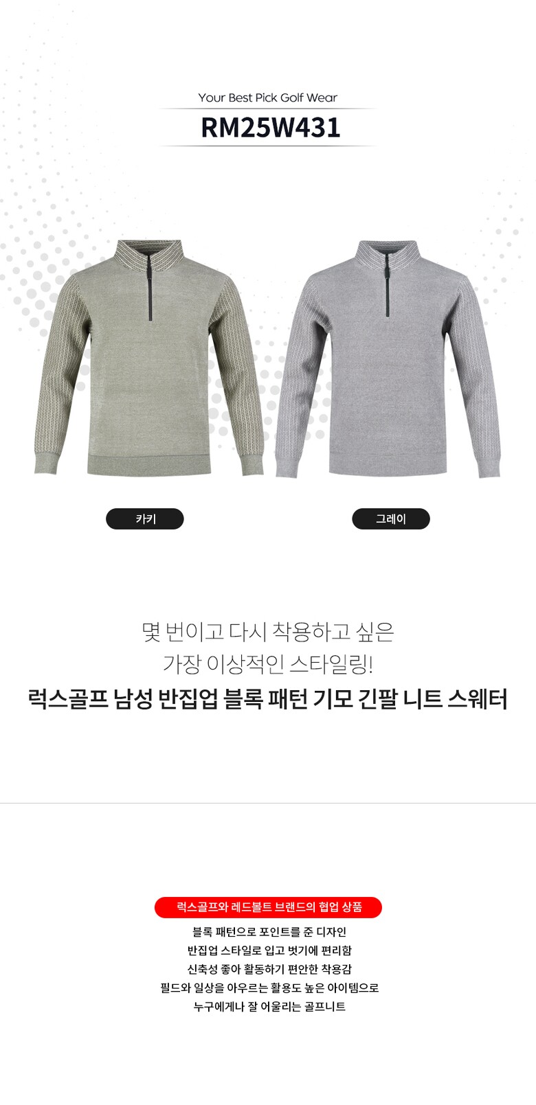 럭스골프 남성 반집업 블록 패턴 기모 긴팔 니트 스웨터 RM25W431