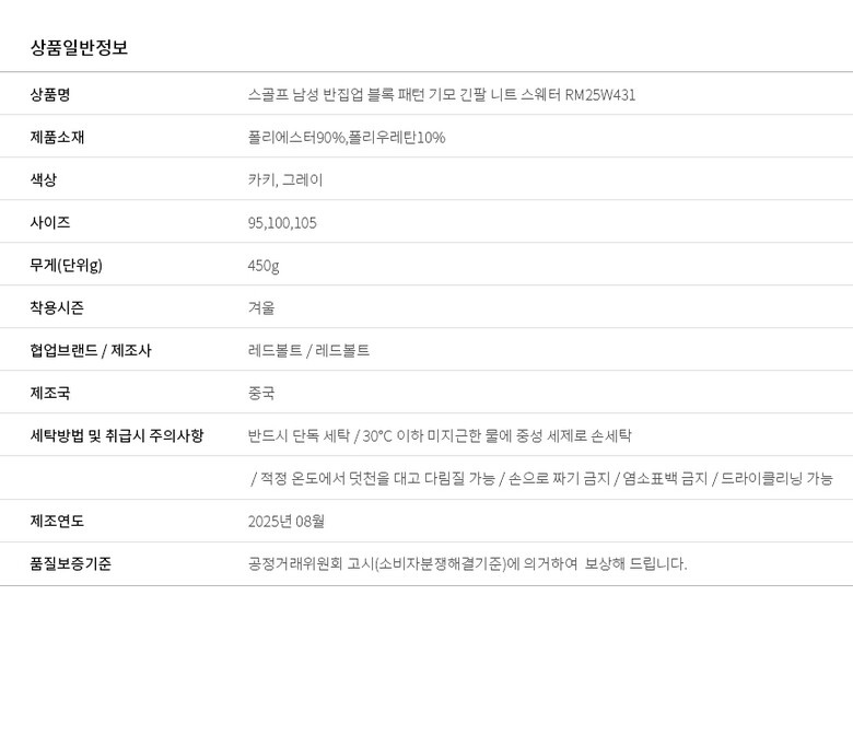 | 6. 세탁방법 및 취급시 주의사항 | 반드시 단독 세탁 / 30℃ 이하 미지근한 물에 중성 세제로 손세탁 / 적정 온도에서 덧천을 대고 다림질 가능 / 손으로 짜기 금지 / 염소표백 금지 / 드라이클리닝 가능 |