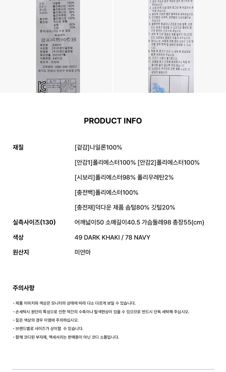 5. 재질 (섬유의 경우 혼용률) | [겉감]나일론100% [안감1]폴리에스터100% [안감2]폴리에스터100% [시보리]폴리에스터98% 폴리우레탄2% [충전백]폴리에스터100% [충전재]덕다운 제품 솜털80% 깃털20% |