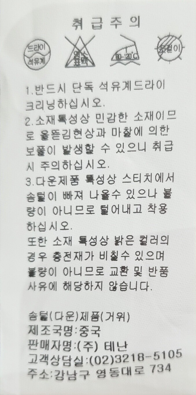 6. 세탁방법 및 취급시 주의사항 1.반드시 단독 석유계 드라이크리닝하십시오. 2.소재특성상 민감한 소재이므로 올뜯김 현상과 마찰에 의한 보풀이 발생할 수 있으니 취급시 주의하십시오. 3.다운제품 특성상 스티치에서 솜털이 빠져 나올수 있으나 불량이 아니므로 털어내고 착용하십시오. 또한 소재 특성상 밝은 컬러의 경우 충전재가 비칠수 있으며 불량이 아니므로 교환 및 반품 사유에 해당하지 않습니다.