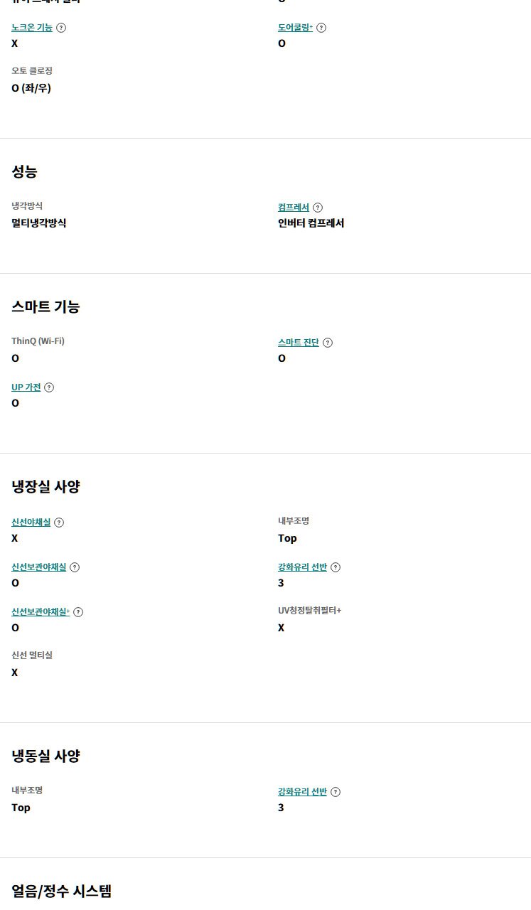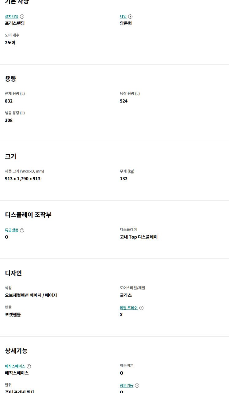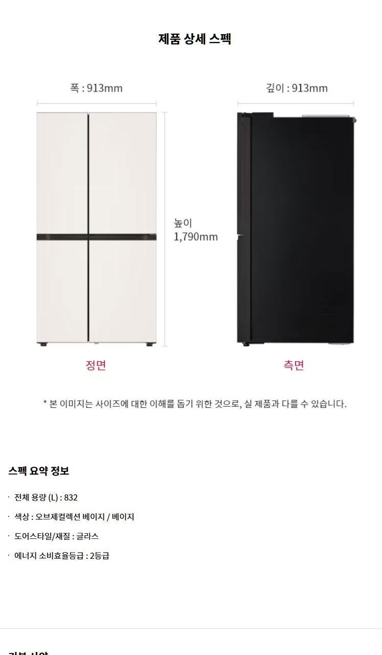 | 6. 크기/무게(폭x높이x깊이)(cm) | 913 x 1,790 x 913 mm, 832L, 양문형냉장고 |