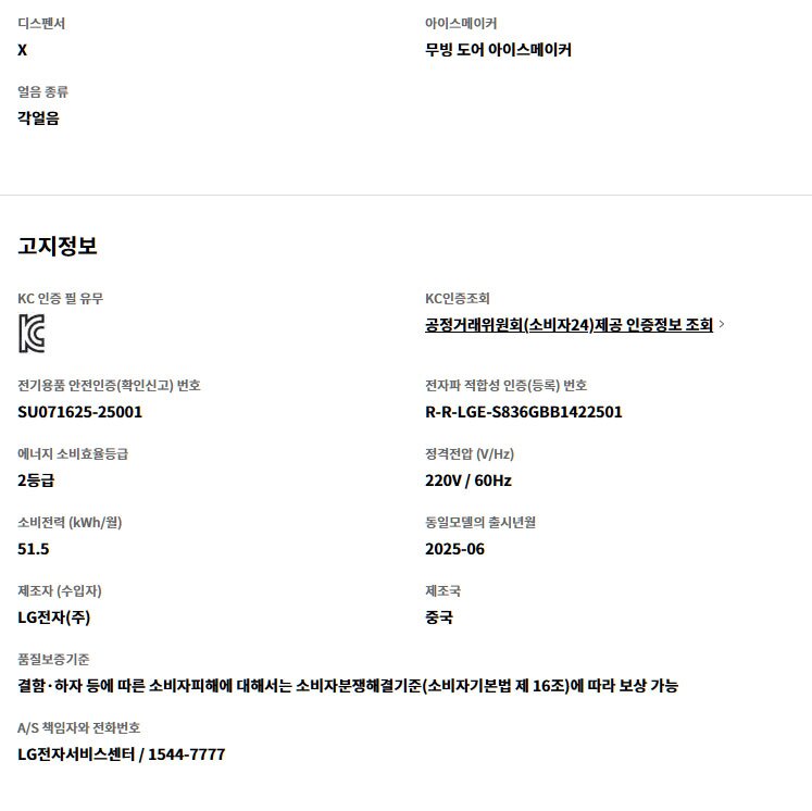 | 3. 전기용품 안전인증 필 유/무 | SU071625-25001, R-R-LGE-S836GBB1422501 |