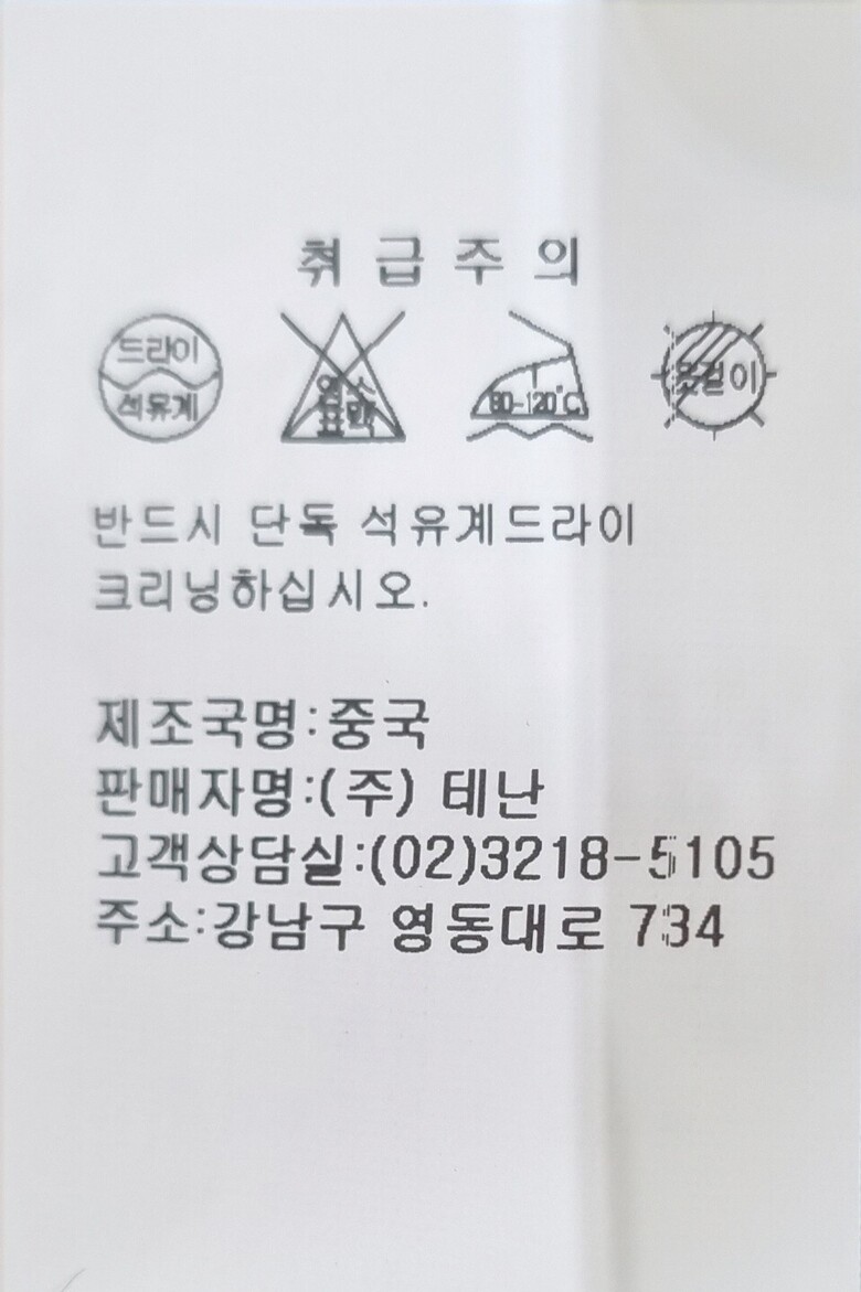 | 6. 세탁방법 및 취급시 주의사항 | 반드시 단독 석유계드라이 크리닝하십시오. |