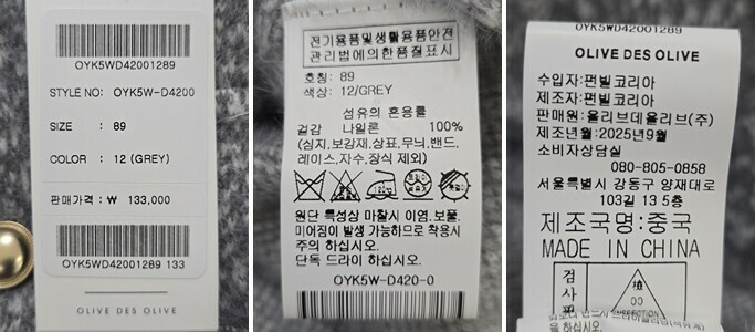 | 6. 세탁방법 및 취급시 주의사항 | 원단특성상 마찰시 이염,보풀,미어짐이 발생 가능하므로 착용시 주의 |