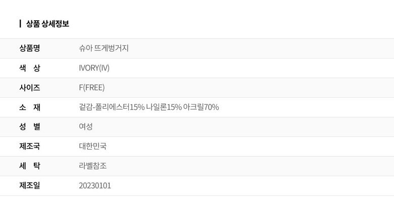 | 2. 소재 | 겉감-폴리에스터15% 나일론15% 아크릴70% |