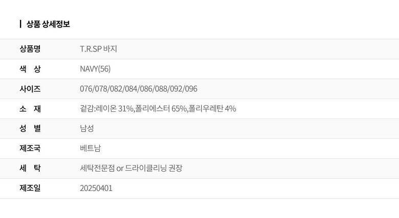 제품소재 : 폴리에스터65%, 레이온31%, 폴리우레탄4%
