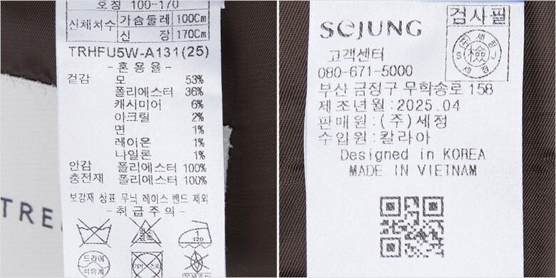 1. 제품 소재 (섬유의 조성 또는 혼용률을 백분율로 표시, 기능성인 경우 성적서 또는 허가서) 겉감 모53%, 폴리에스터36%, 캐시미어6%, 아크릴2%, 면1%, 레이온1%, 나일론1% 안감 폴리에스터100% 충전재 폴리에스터100%