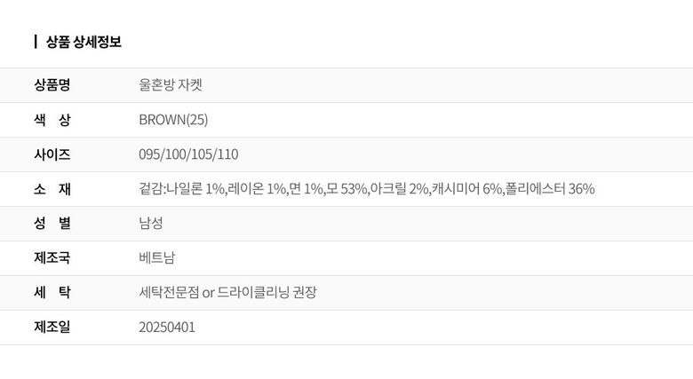 제품소재 : 겉감 모53%, 폴리에스터36%, 캐시미어6%, 아크릴2%, 면1%, 레이온1%, 나일론1% 안감 폴리에스터100% 충전재 폴리에스터100%
