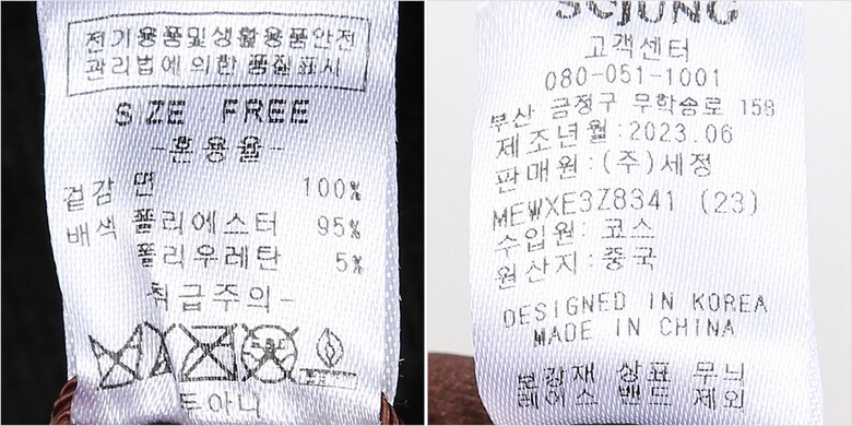 | 2. 소재 | 겉감:면100% 배색:폴리에스터95% 폴리우레탄5% |