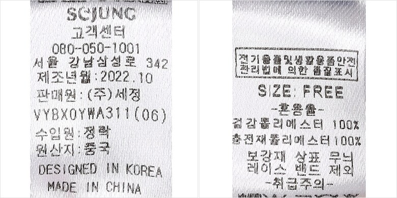 | 2. 소재 | 겉감-폴리에스터100% 충전재:폴리에스터100% |