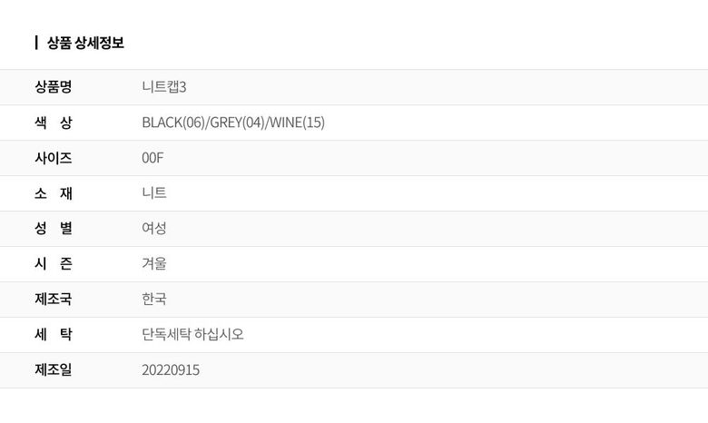 | 기타 기준 사항 | 상품불량에 의한 반품, A/S, 품질보증 및 피해보상 등에 관한 사항은 소비자 분쟁해결기준(공정거래위원회 고시) 구매자가 미성년자인 경우에는 상품 구입시 법정대리인이 동의하지 아니하면 미성년자 본인 또는 법정대리인이 구매취소 할 수 있습니다. |