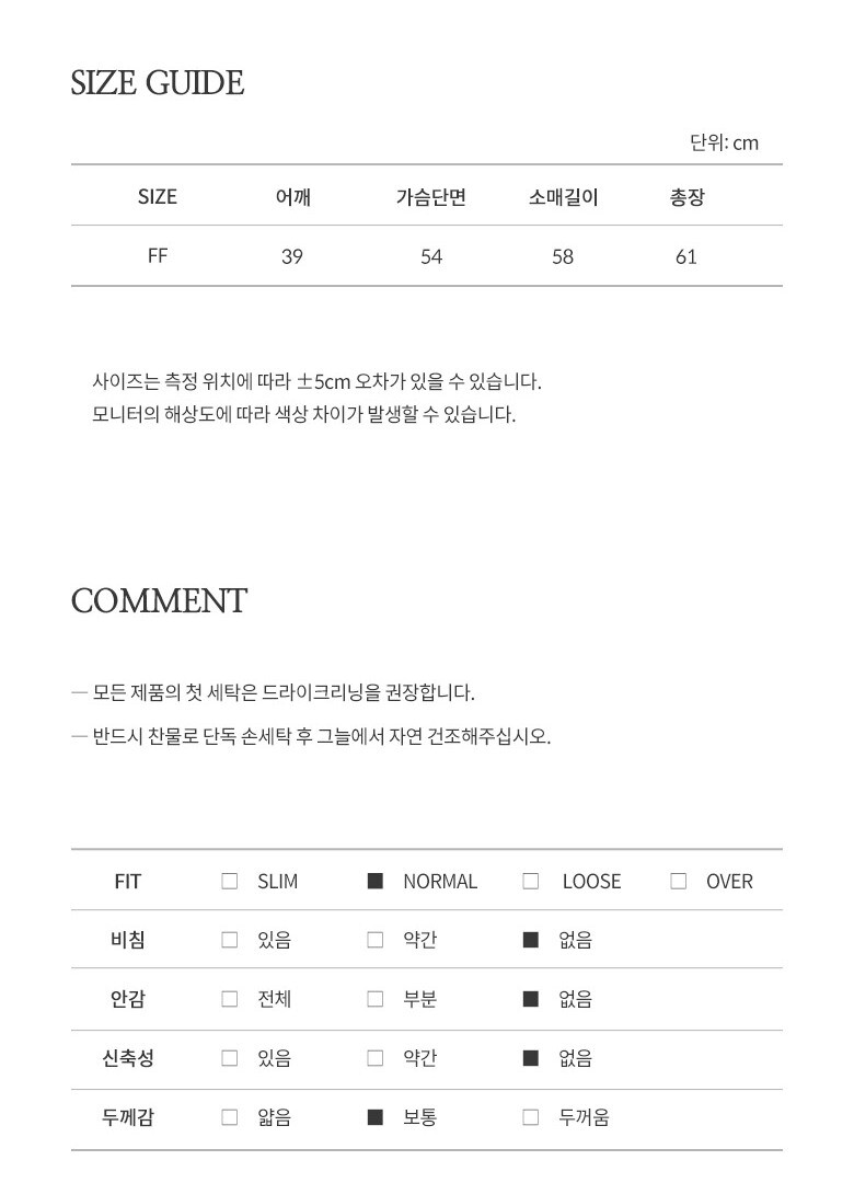 • 처음 배송된 상품상태와 다를 경우(세탁/착용 후 외출하신 경우) 반품이 불가합니다.