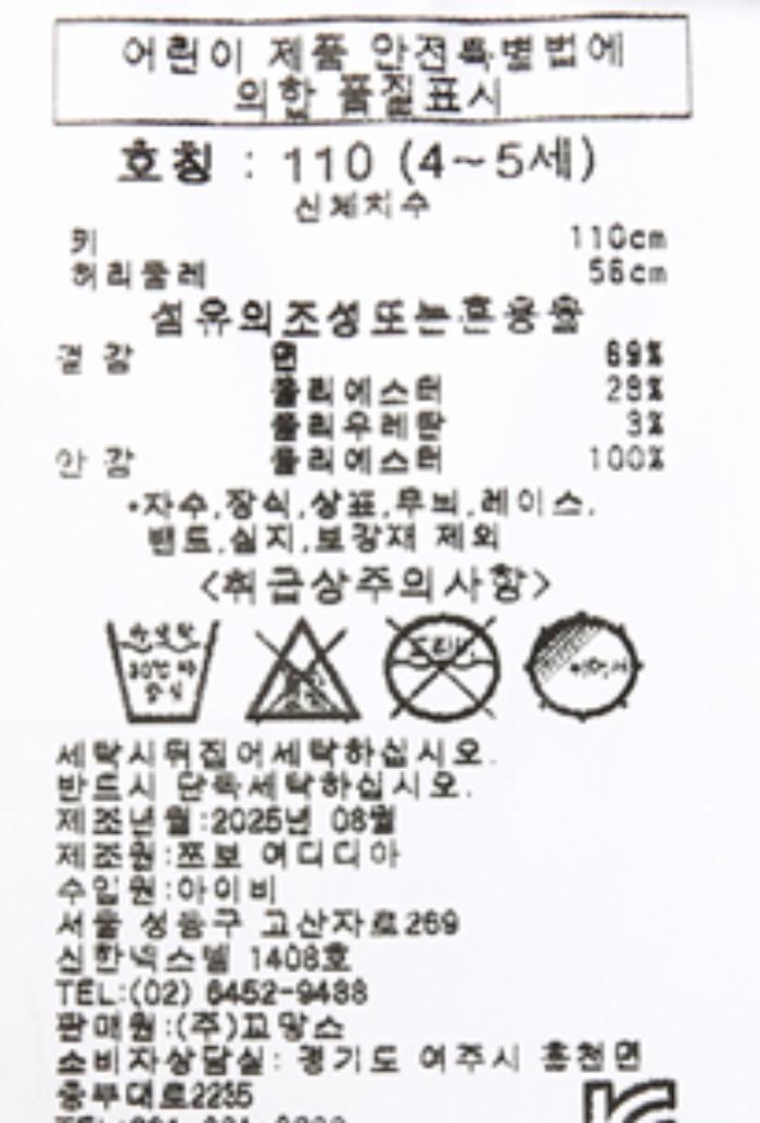 | 5. 재질 (섬유의 경우 혼용률) | 면 69% 폴리에스터 28% 폴리우레탄 3% |