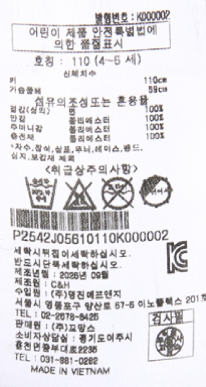 5. 재질 (섬유의 경우 혼용률) 겉감 면 100% 안감 충전재 폴리에스터 100%