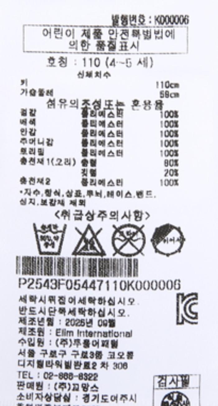 제품소재 : 겉감 안감 폴리에스터 100% 충전재 오리솜털 80% 오리깃털 20%