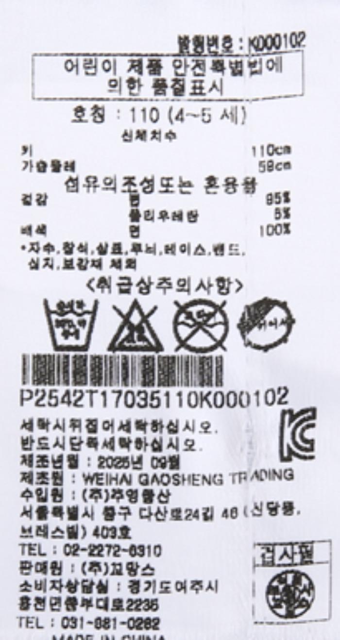 | 1. 제품 소재 (섬유의 조성 또는 혼용률을 백분율로 표시, 기능성인 경우 성적서 또는 허가서) | 면 95% 폴리우레탄 5% |