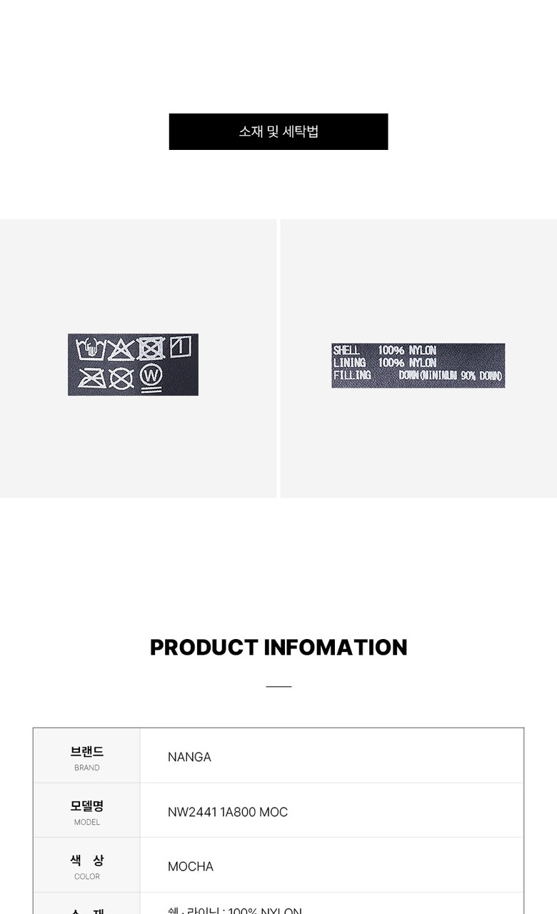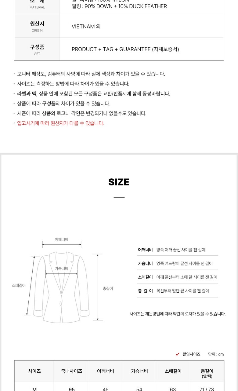 | 1. 제품 소재 (섬유의 조성 또는 혼용률을 백분율로 표시, 기능성인 경우 성적서 또는 허가서) | 쉘·라이닝 : 나일론 100% / 필링 : 다운 90% + 덕페더 10% |