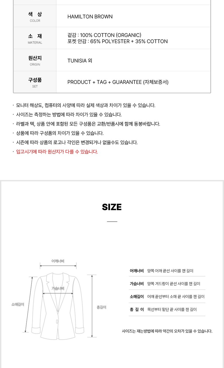 | 1. 제품 소재 (섬유의 조성 또는 혼용률을 백분율로 표시, 기능성인 경우 성적서 또는 허가서) | 겉감 : 코튼 100% (오가닉) / 포켓 안감 : 폴리에스터 65% + 코튼 35% |