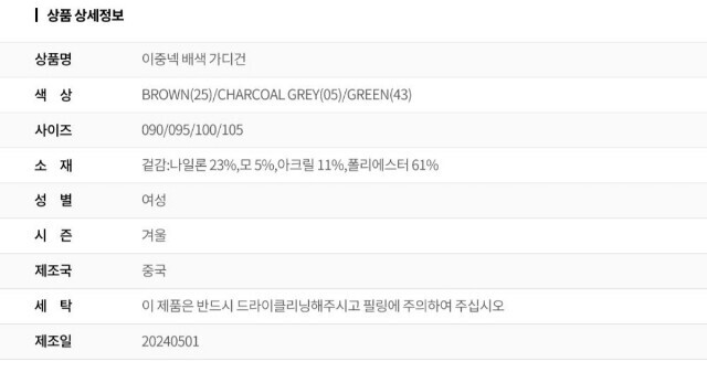 | 6. 세탁방법 및 취급시 주의사항 | 상품상세참조 |