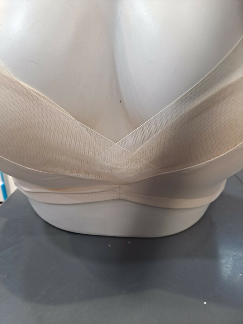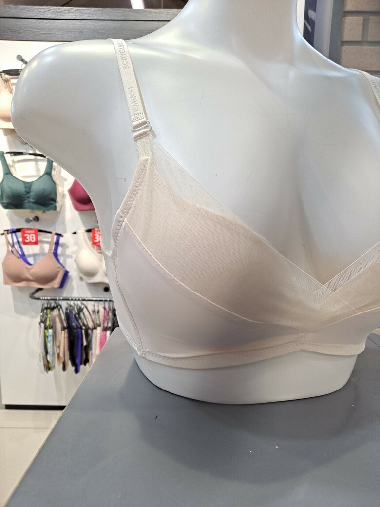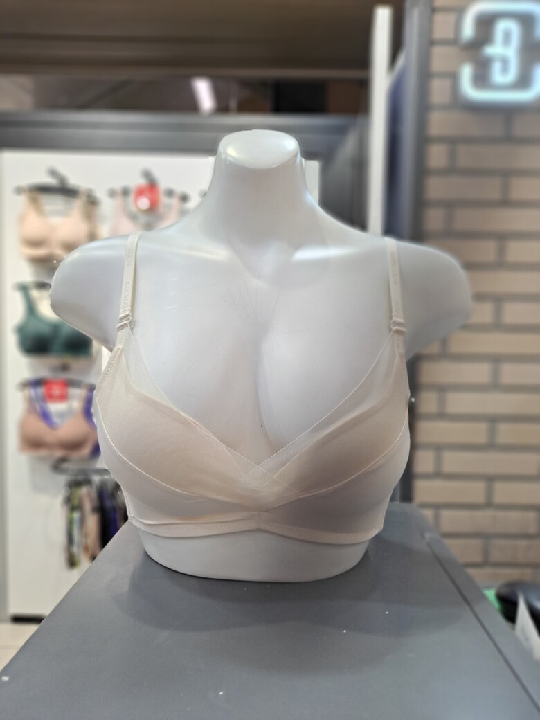 상단의 HEM원단이 크로스로 한번 더 가슴을 잡아주고 컵상변의 들뜸은 보완해주고 볼륨까지 한 번 더 살려주는 스타일.