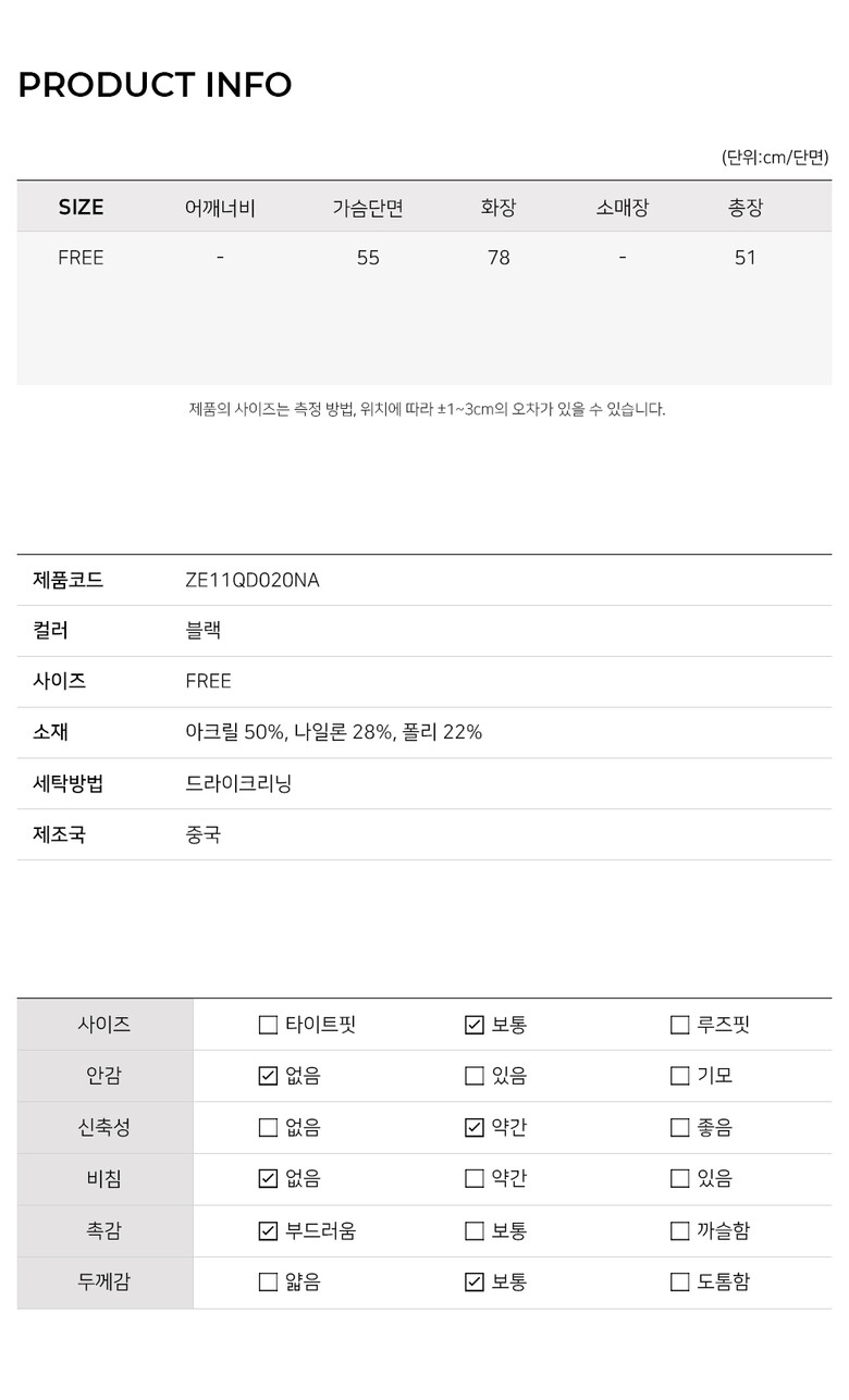 | 1. 제품 소재 (섬유의 조성 또는 혼용률을 백분율로 표시, 기능성인 경우 성적서 또는 허가서) | 아크릴 50% 나일론 28% 폴리에스터 22% |