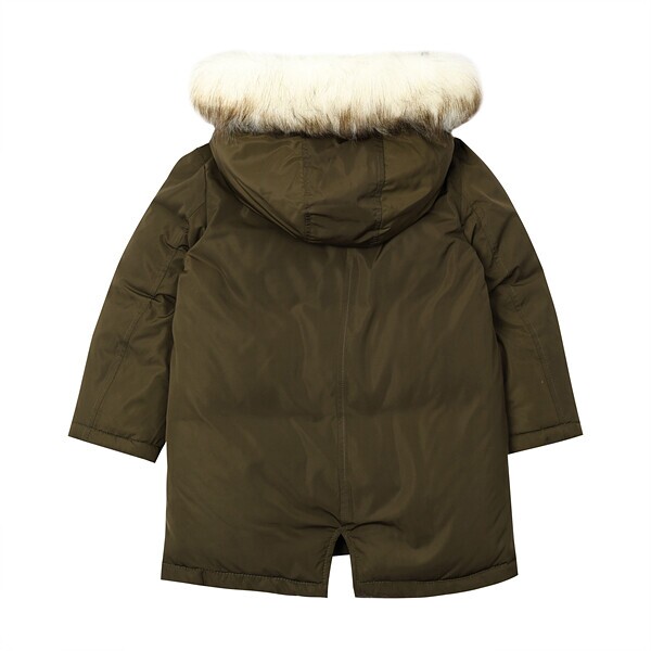 - 밀도있는 화섬소재를 사용한 충전재 중 솜털함량 80% 덕다운 더플 단추 카키 롱다운