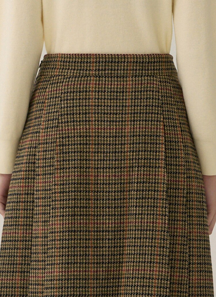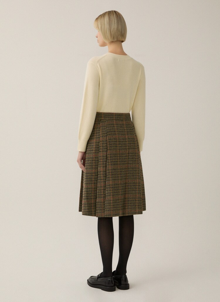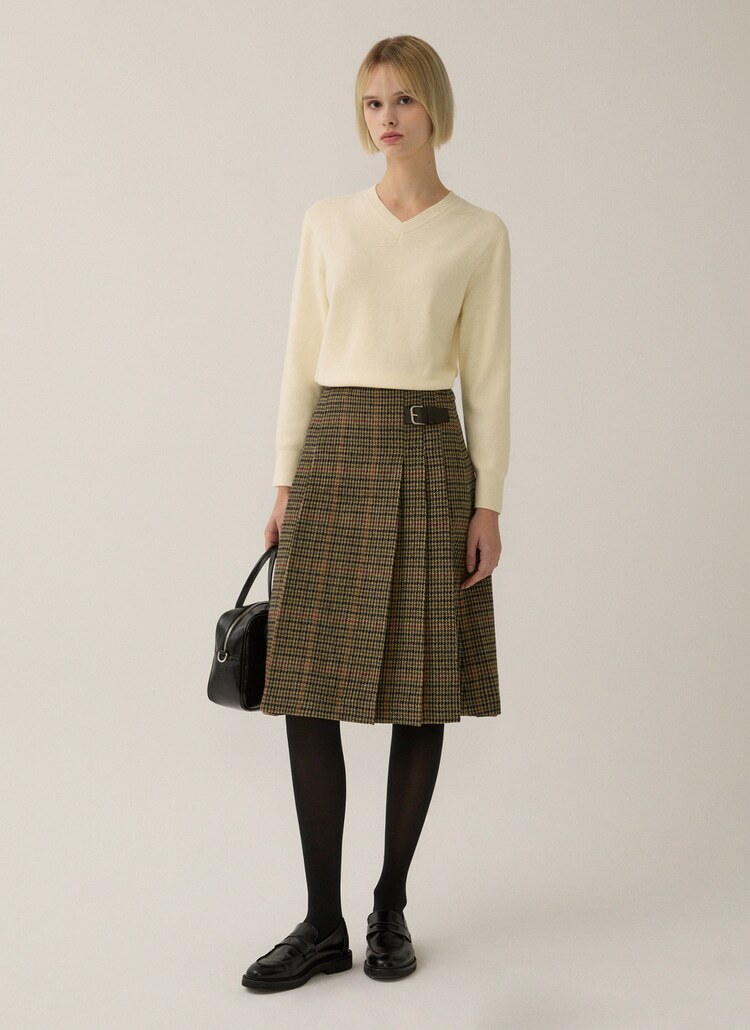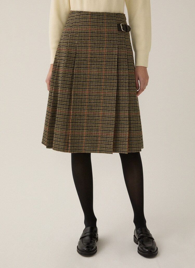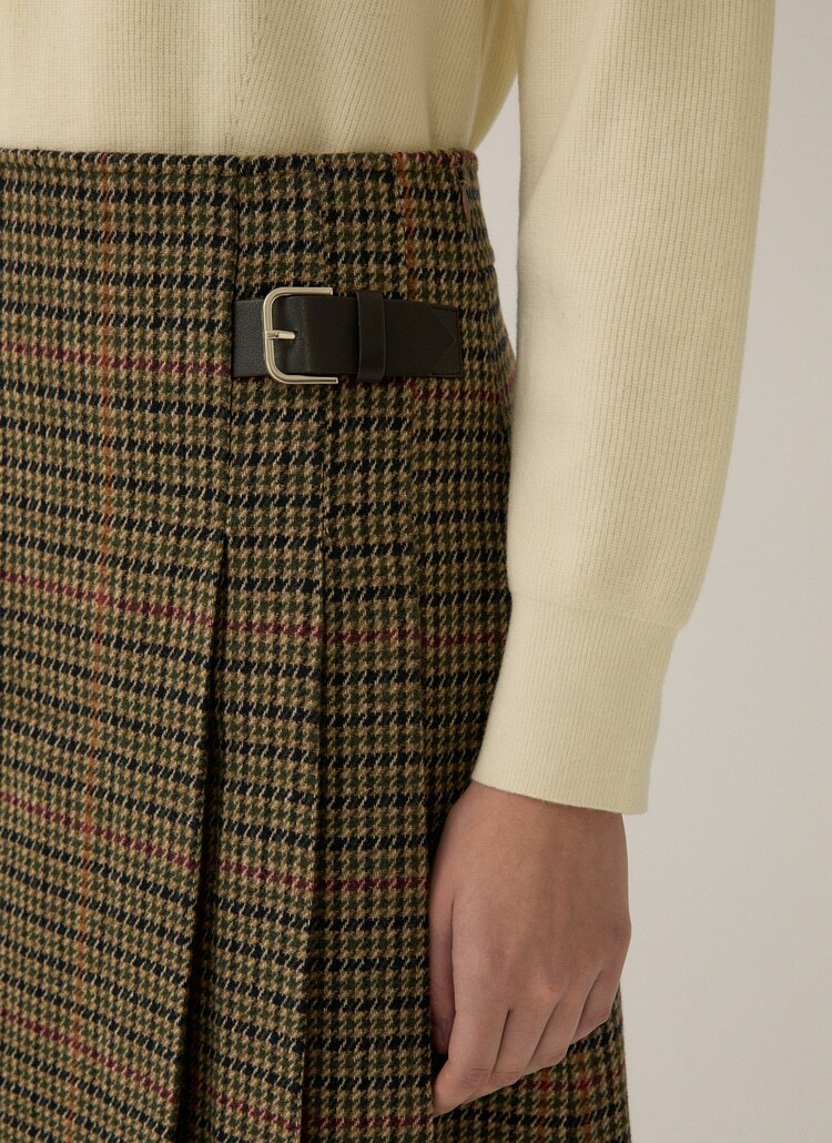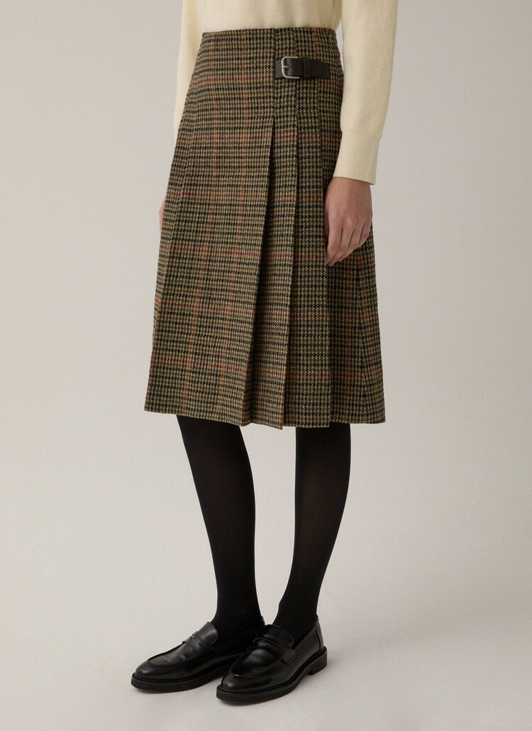 버클 장식으로 포인트를 준 미디 기장의 울 혼방 플리츠 스커트입니다.