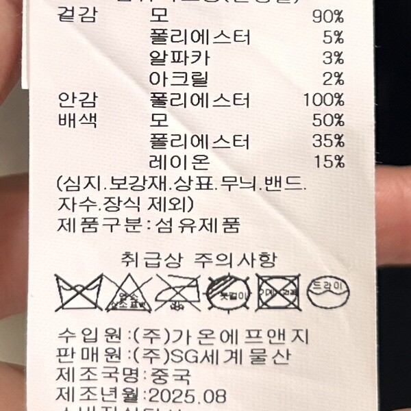 제품소재 : 겉감-모90% 폴리에스터5% 알파카3% 아크릴2% 안감-폴리에스터100%배색-모50% 폴리에스터35% 레이온15%